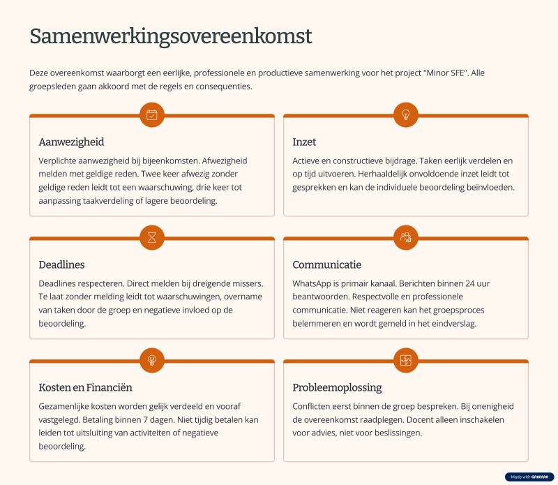 Dit document beschrijft de afspraken en regels voor een duidelijke, eerlijke en professionele samenwerking binnen het project. Door afspraken te maken over aanwezigheid, inzet, communicatie, deadlines, financiën en probleemoplossing zorgen de groepsleden voor structuur, onderlinge verantwoordelijkheid en een prettig samenwerkingsproces.